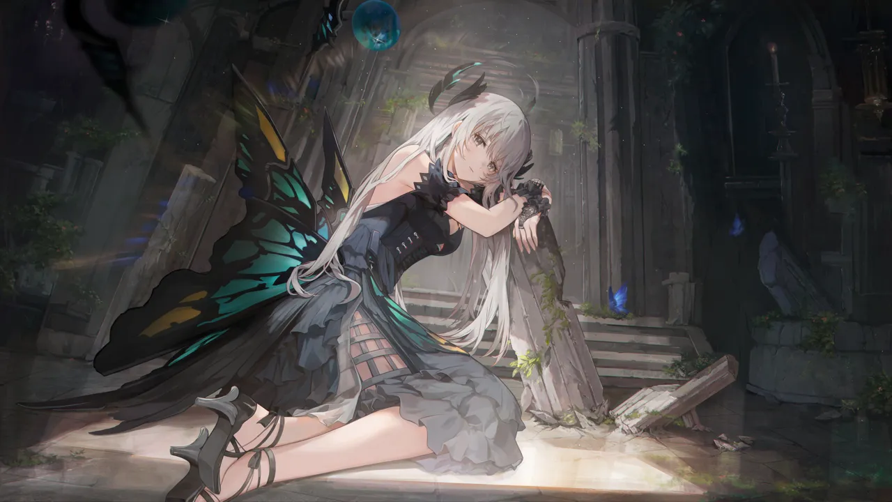 1girlblack_dressblack_sandalsblurryblurry_foregroundbrown_eyesbugbutterflybutterfly_wingsclosed_mouthdresshair_between_eyeshigh_heelsindoorsinsect_wingskneelinglayered_dresslong_hairruinssandalssolowhite_hairwings