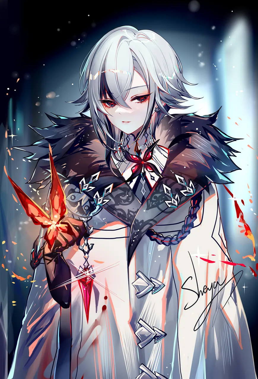 1girlandrogynousartist_nameblack_eyesblack_glovesblack_hairblack_streakscloakfatui_coatfur-trimmed_cloakfur_trimglovesgrey_hairlooking_at_viewermulticolored_hairparted_lipsred_pupilsshort_hairsignaturesolostreaked_hairsymbol-shaped_pupilsupper_bodywhite_cloakx-shaped_pupils
