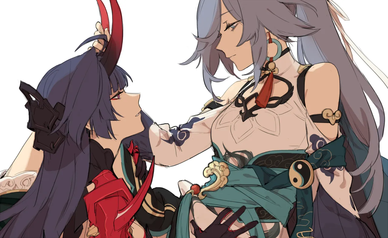 2girlsaqua_capearm_strapbare_shouldersbird_hair_ornamentblack_glovesblue_eyesblue_hairbreastscapechina_dresschinese_clothescleavagecleavage_cutoutclothing_cutoutdetached_sleevesdressearringseyelinereyeshadowfrom_sideglovesgrey_hairhair_ornamenthair_over_one_eyehairpinhand_on_another's_stomachhanfuhigh_ponytailholdinghornsjewelryleaning_forwardlong_hairmakeupmedium_breastsmultiple_girlspaintbrushpaintbrush_hair_ornamentpleated_sleevesponytailpurple_eyespurple_hairred_eyelinerred_eyeshadowsashshoulder_cutoutsingle_earringsmall_breastssmiletasseltassel_earringswhite_backgroundwhite_dresswide_sleevesyin_yangyuri