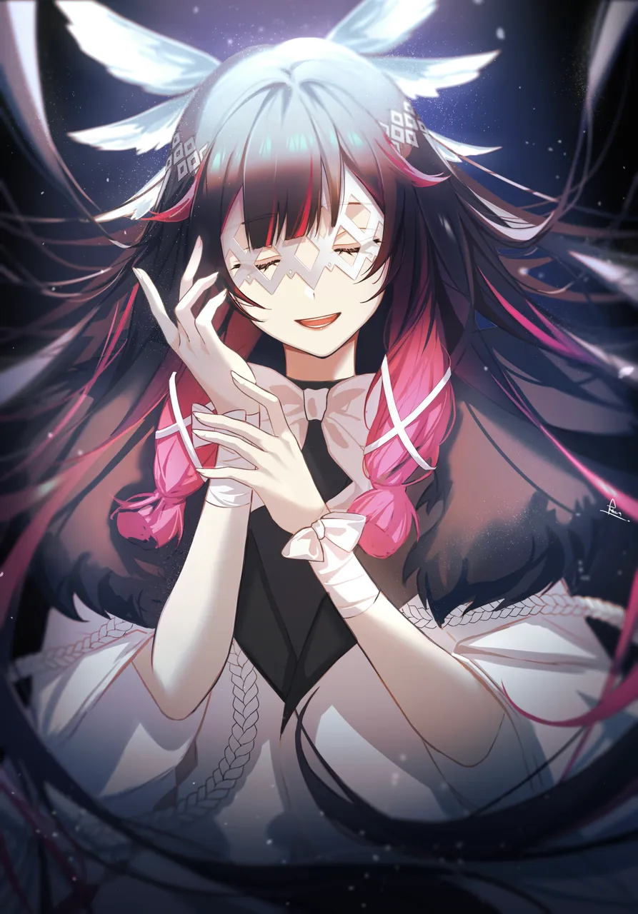 1girlbowbowtieclosed_eyeseye_maskfatui_coatfloating_hairhair_ornamenthair_spread_outhime_cutlong_hairmaskmulticolored_hairpink_hairpurple_hairsmilesolotwo-tone_hairvery_long_hair