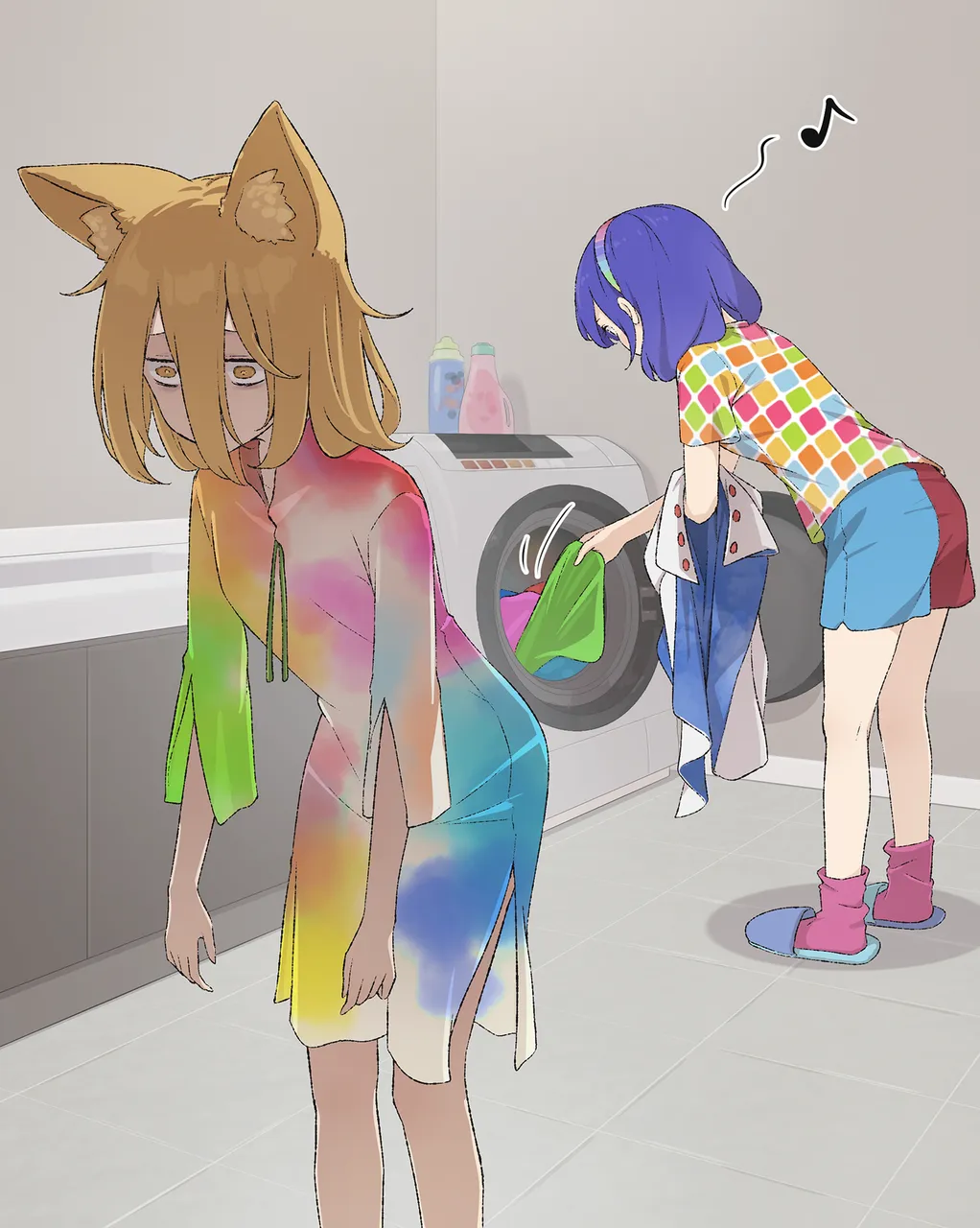 2girlsalternate_coloralternate_costumeanimal_earsblonde_hairblue_haircovered_mouthdetergentfox_earsfox_girlhair_between_eyeshairbandlaundrylong_sleevesmulticolored_clothesmulticolored_hairbandmultiple_girlsmusical_noterainbow_gradientribbonrompershort_hairstained_clothessurprisedwashing_machineyellow_eyes