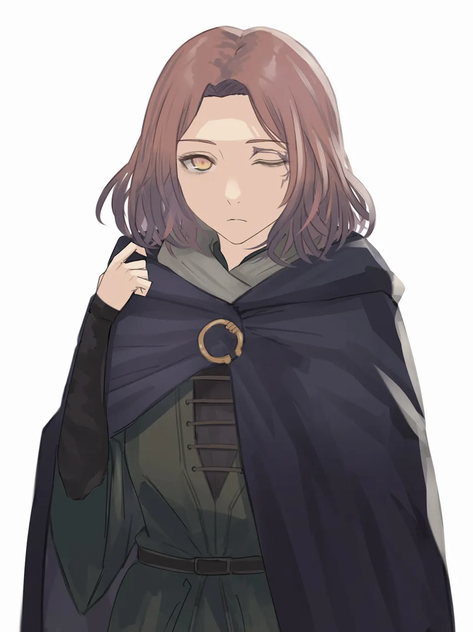 1girladjusting_hoodblack_cloakblue_cloakbrown_eyescloakclosed_mouthgreen_tunicholding_cloakhoodhood_downhooded_cloaklooking_at_viewermedium_hairone-eyedone_eye_closedscarscar_across_eyescar_on_facesolotunicwhite_backgroundyellow_eyes