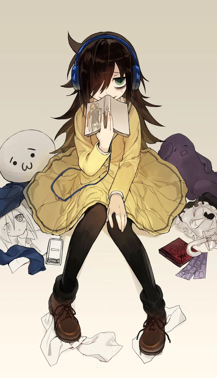 1girl:3bags_under_eyesblack_hairblack_pantyhoseblazerbookbrown_shoescovering_own_mouthdrawing_(object)full_bodygreen_eyeshair_over_one_eyehand_on_own_kneehand_upheadphonesholdingholding_bookjacketknees_together_feet_apartlong_hairlong_skirtlong_sleeveslooking_at_viewermessy_hairon_floorone_eye_coveredopen_bookpantyhosepaperpleated_skirtschool_uniformshoessittingskirtsolosweatdropumbrellaunworn_clotheswhite_backgroundyellow_jacketyellow_skirt