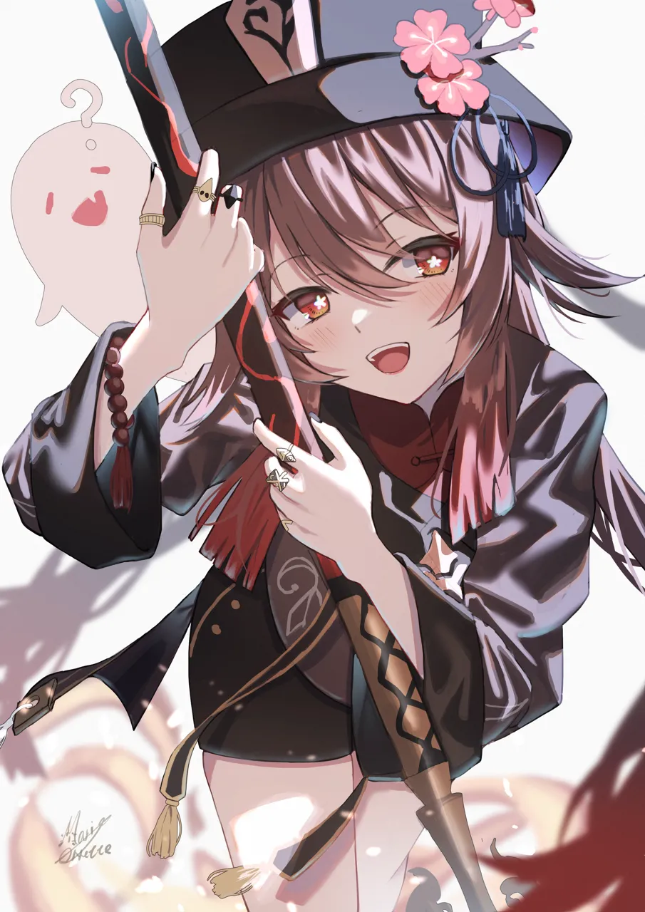 1girlbead_braceletbeadsblack_headwearblack_nailsblack_shortsbraceletbrown_hairchinese_clothescoattailscollared_coatcolored_tipsflowerflower_shaped_pupilsghostgradient_hairhathat_flowerjewelrylong_hairlooking_at_viewermulticolored_hairmultiple_ringsopen_mouthplum_blossomsporkpie_hatred_eyesred_hairringshortssignaturesimple_backgroundstaff_of_homa__genshin_impactsymbol_shaped_pupilstailcoattasselthumb_ringtwintailswhite_background