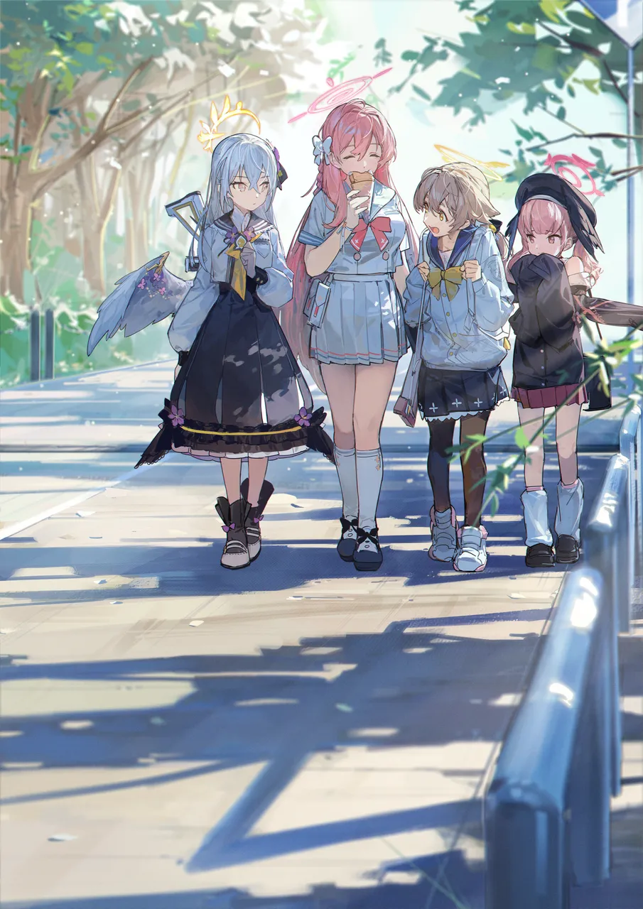 4girlsassault_rifleberetblack_bootsblack_handwearblack_pantyhoseblack_serafukublack_shoesblue_sailor_collarblue_skirtbolt_actionbootsbowbowtiebraidbrown_hairclosed_mouthdayeatingfacing_viewerfoodgunhair_between_eyeshair_bowhalohathead_wingsholdingholding_behind_backholding_foodholding_weapon_behind_backkneehighslong_hairlong_skirtlong_sleeveslooking_at_anotherloose_socksm4_carbinemake-up_work_club_(blue_archive)multiple_girlsneckerchiefoff_shoulderopen_mouthoutdoorsp14_enfieldpantyhosepink_bowpink_bowtiepink_hairpleated_skirtponytailrifleroadsailor_collarschool_uniformserafukushadowshirtshoesside_braidskirtsleeves_past_fingerssleeves_past_wristssocksstandingtwintailswalkingweaponwhite_bowwhite_hairwhite_shirtwhite_shoeswhite_skirtwhite_sockswhite_wingswinged_hatwingsyellow_bowyellow_bowtieyellow_eyesyellow_neckerchief