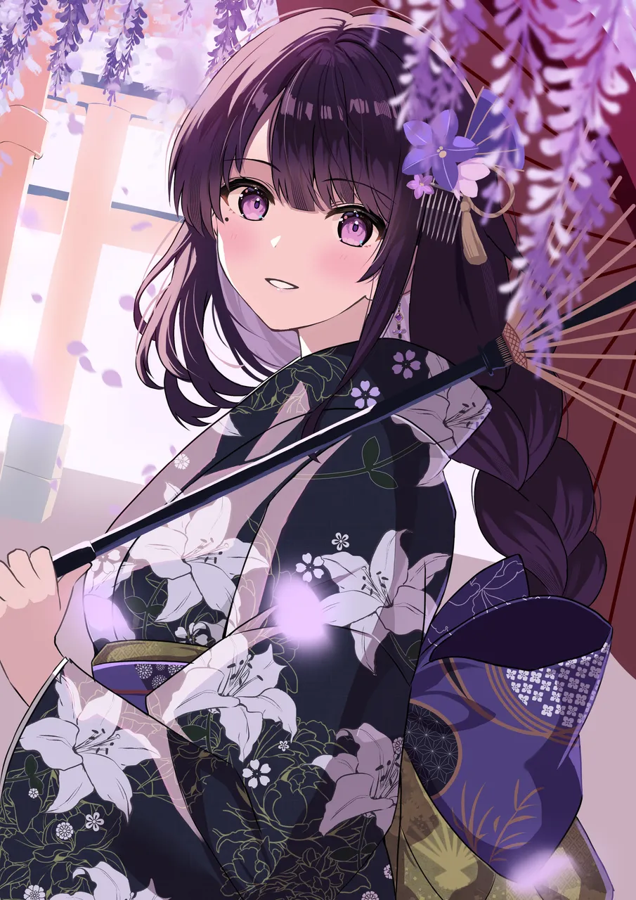 1girlblack_kimonoblunt_bangsblushfalling_petalsfloral_printflowerfrom_sidehair_between_eyesholdingholding_umbrellajapanese_clotheskimonolily_printlooking_at_viewermolemole_under_eyemultiple_toriiobiobiageoil-paper_umbrellapeony_printpetalsplantprint_kimonopurple_eyespurple_hairsashsmilesolotoriiturning_headumbrellaumbrella_over_shoulderupper_bodywisteria