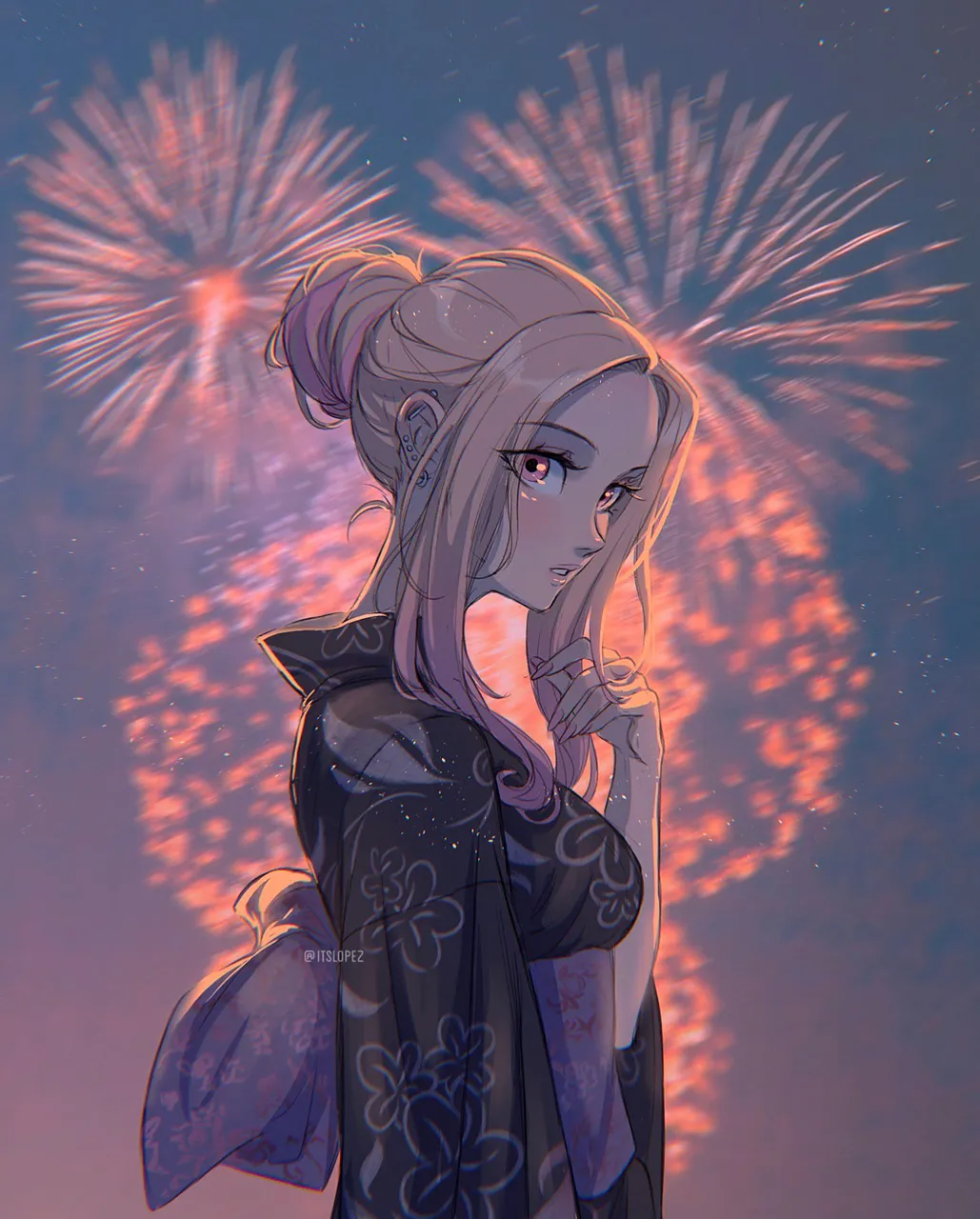 1girlaerial_fireworksback_bowblonde_hairbowbreastsearringsfingernailsfireworksfloral_printforeheadhair_bunhand_in_own_hairjapanese_clothesjewelrykimonolong_bangslong_fingernailslong_hairlooking_at_viewermedium_breastsmultiple_earringsoutdoorsparted_bangsparted_lipsred_eyessoloupper_body