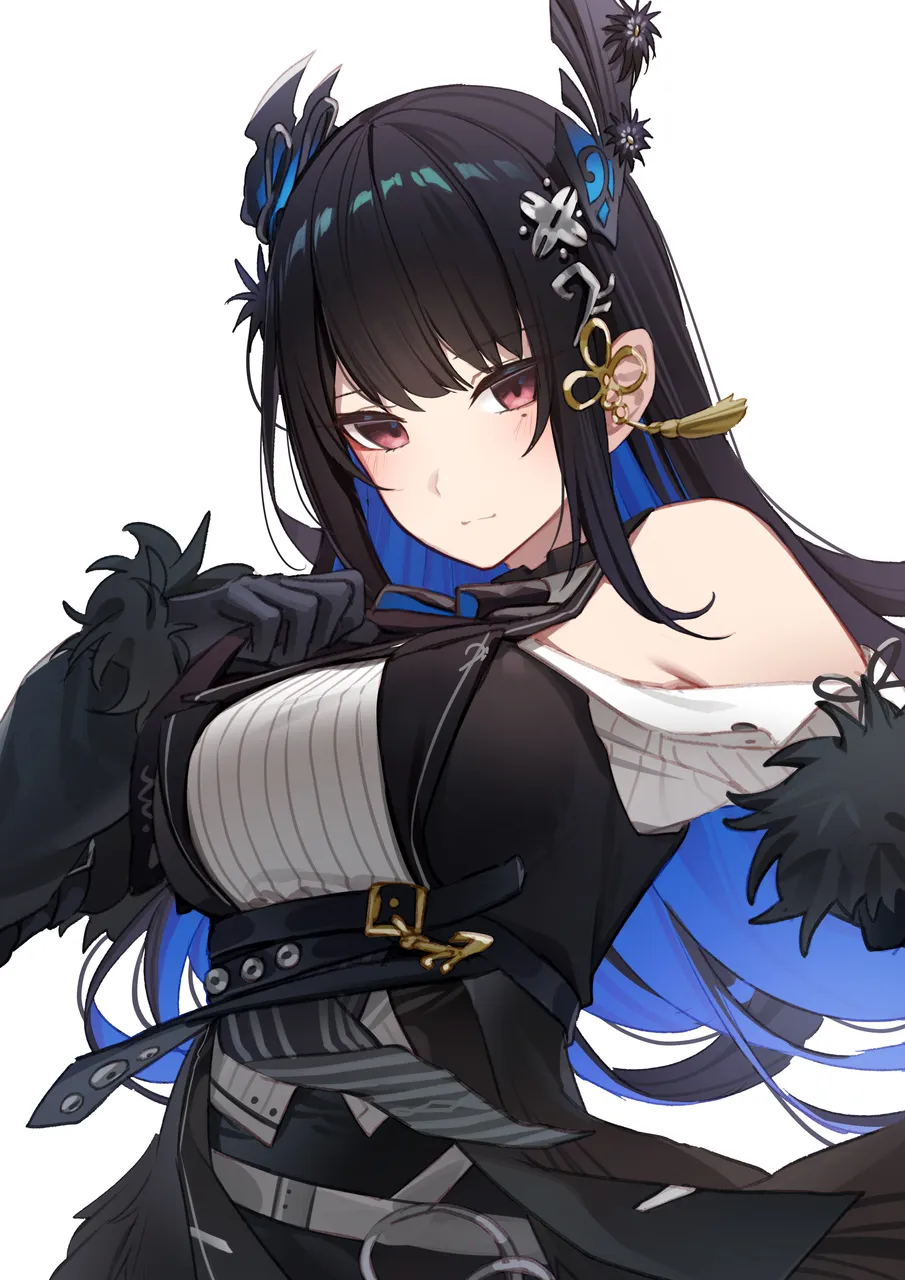 1girlarmpit_creaseasymmetrical_hornsblack_hairblack_hornsblue_hairbreastscolored_inner_hairdemon_hornsfur_trimhornslarge_breastslong_hairlooking_at_viewermulticolored_hairpurple_eyessimple_backgroundsolouneven_hornsupper_bodyvirtual_youtuberwhite_background
