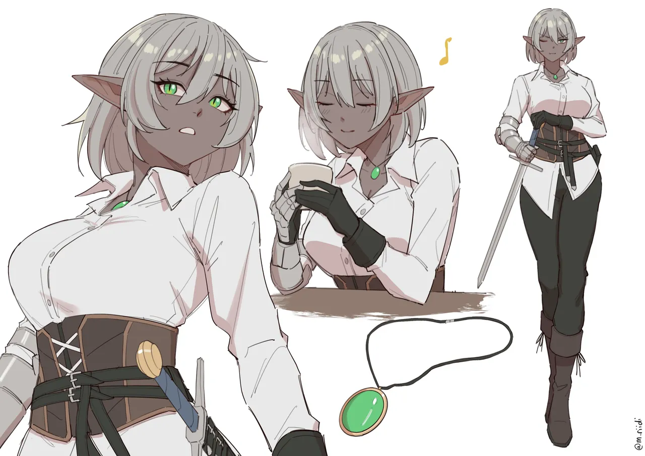 1girlblack_glovesblack_pantsblushbootsbreastsbrown_bootsclosed_eyescollared_shirtcorsetcupdark-skinned_femaledark_elfdark_skindress_shirtelffull_bodygauntletsglovesgreen_eyesgrey_hairhair_between_eyesholdingholding_cupjewelrylong_sleeveslooking_awaymultiple_viewsmusical_notenecklaceone_eye_closedpantspointy_earsshirtshort_hairsimple_backgroundsingle_gauntletswordweaponwhite_backgroundwhite_shirt