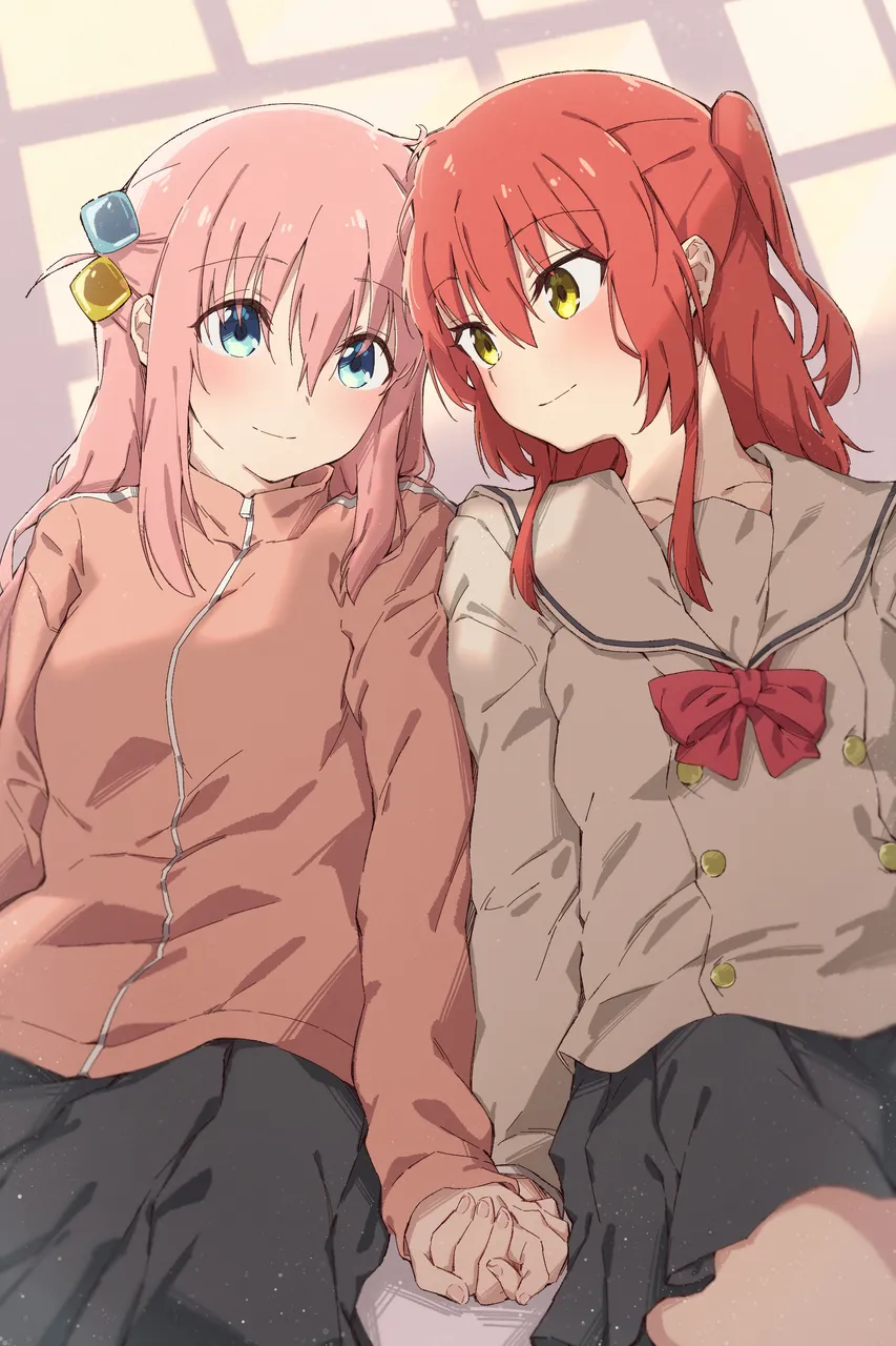 2girlsagainst_wallasymmetrical_bangsblue_eyesblushbowcube_hair_ornamenthair_between_eyeshair_ornamentheads_togetherholding_handsjacketleaning_on_personlong_hairlong_sleeveslooking_at_anotherlooking_at_viewermedium_hairminiskirtmultiple_girlsneckerchiefout_of_framepink_hairpleated_skirtponytailred_hairschool_uniformserafukushoulder-to-shouldershuka_high_school_uniformside_ponytailsidelockssittingskirtsmilethighstrack_jacketyellow_eyesyuri