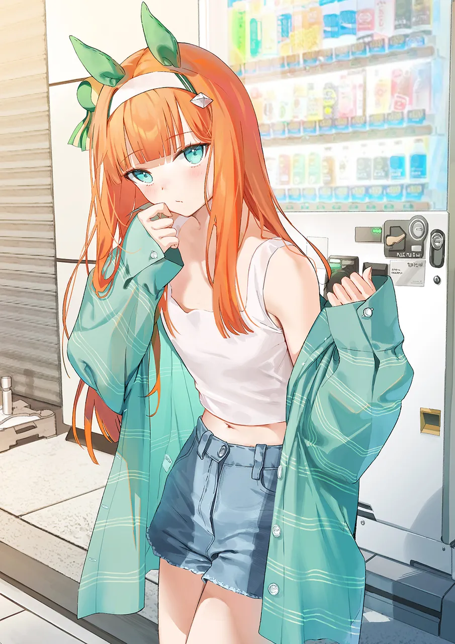 1girlanimal_earsaqua_eyesaqua_jacketblue_shortsblunt_bangscasualclosed_mouthdenimdenim_shortshair_ornamenthairbandhand_on_own_facehorse_earshorse_girljacketlong_hairlong_sleeveslooking_at_viewernavelopen_clothesopen_jacketorange_hairoutdoorsshirtshortssidelockssleevelesssleeveless_shirtsolostandingwhite_hairbandwhite_shirtwide_sleeves