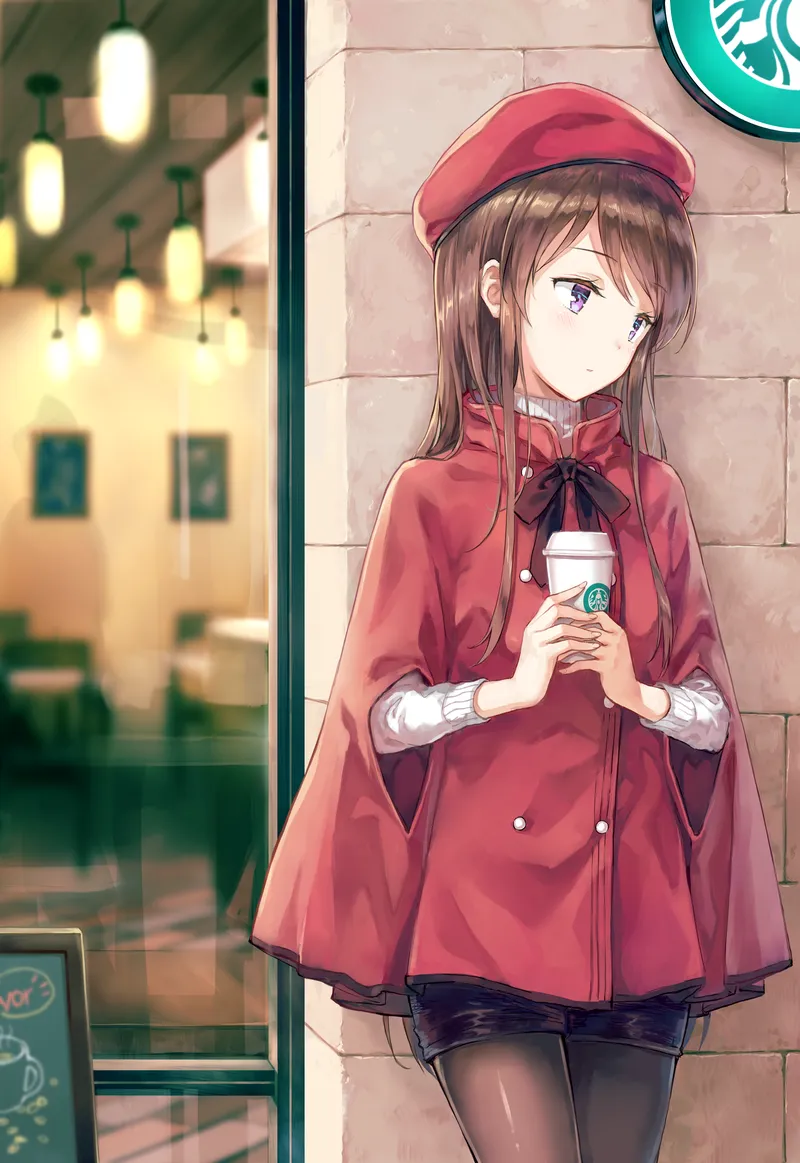 1girlberetblack_pantyhoseblurryblushbrown_haircasualcoatcowboy_shotcupdepth_of_fielddisposable_coffee_cupdisposable_cupeyebrowshatholdinglong_hairlooking_to_the_sidemenu_boardoutdoorspantyhosepurple_eyesred_hatshortssolostandingwindow