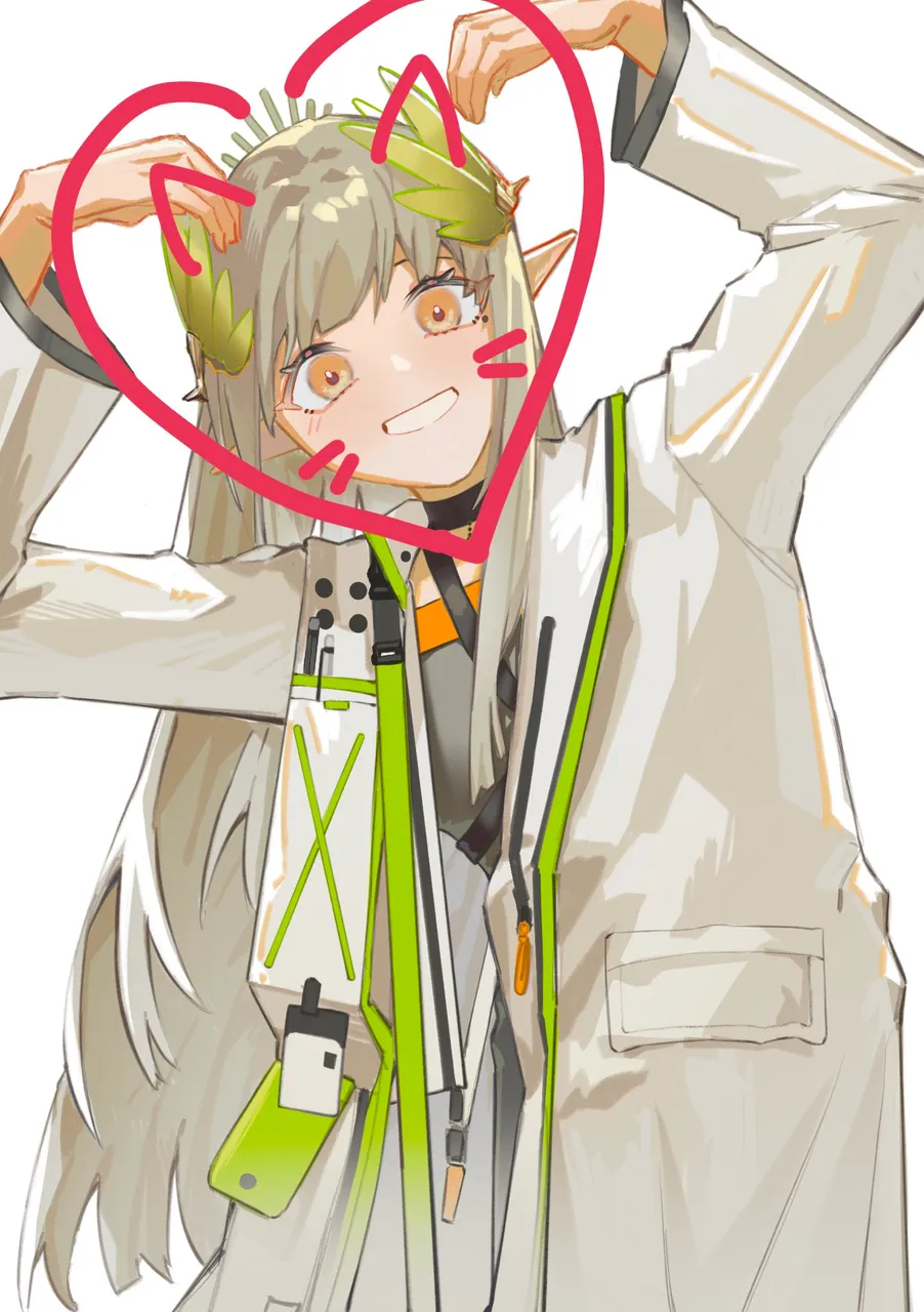 1girlanimal_earsarms_upblack_shirtblushcoatdrawn_earselffake_animal_earsfeather_hairgrey_hairgrinhair_ornamentheartheart_armsid_cardlab_coatlong_hairlooking_at_viewerpointy_earsshirtsimple_backgroundsmilesoloteethupper_bodywhite_backgroundwhite_coatyellow_eyes