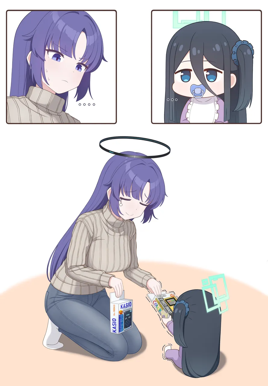 ...2girlsaged_downaged_upalternate_costumebabyblack_hairblue_eyesblue_hairblue_pantsbrand_name_imitationbreastscalculatorcasioclosed_eyesclosed_mouthcryingdenimgame_boygame_boy_colorgreen_halohair_between_eyeshalohandheld_game_consoleholdingjeanskneelinglarge_breastslong_bangslong_hairlong_hair_between_eyeslong_sleevesmechanical_halomultiple_girlsmultiple_viewsno_shoesone_side_uppacifierpantsparted_bangsribbed_sweatersockssweatertremblingwhite_socks