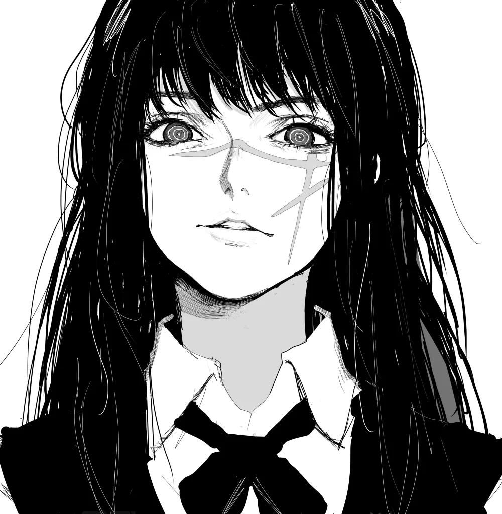 1girlcollared_shirtcross_scarfourth_east_high_school_uniformgreyscalelong_hairlooking_at_viewermonochromeneck_ribbonportraitribbonringed_eyesscarscar_on_cheekscar_on_facescar_on_noseschool_uniformshirtsimple_backgroundsolowhite_background