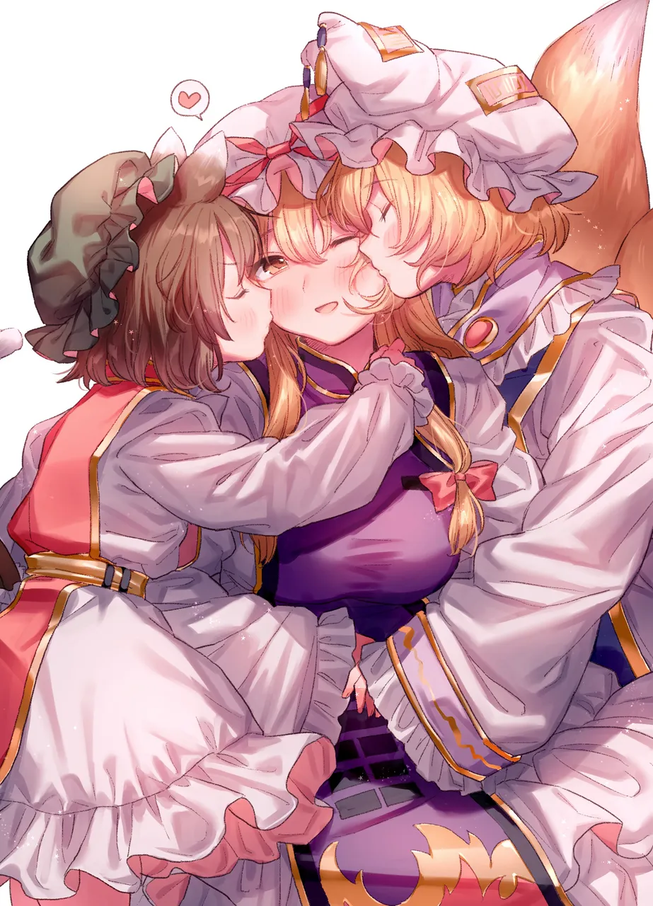 3girlsage_differenceanimal_earsblonde_hairblushbowcat_earsclosed_eyesfox_tailgreen_hathair_bowhatheartkisslong_hairlong_sleevesmob_capmultiple_girlsmultiple_tailsone_eye_closedonee-loliopen_mouthred_bowshort_hairsimple_backgroundsmilespoken_hearttailwhite_backgroundwhite_hatyakumo_family_(touhou)yuri