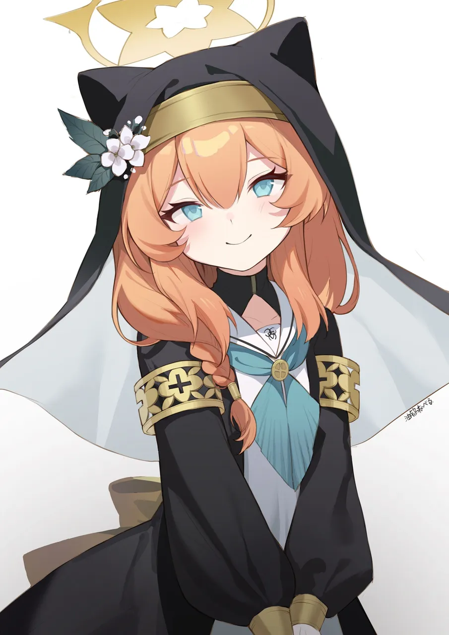 1girlanimal_ear_headwearanimal_earsarmbandartist_nameblack_veilblue_neckerchiefbraidclosed_mouthcowboy_shotflowerhair_between_eyeshair_tubeshalohathat_flowerlight_blushlong_sleeveslooking_at_viewerneckerchiefnunorange_hairpuffy_sleevessailor_collarsimple_backgroundsingle_braidsmilesolov_armsveilwhite_backgroundwhite_sailor_collaryellow_halo
