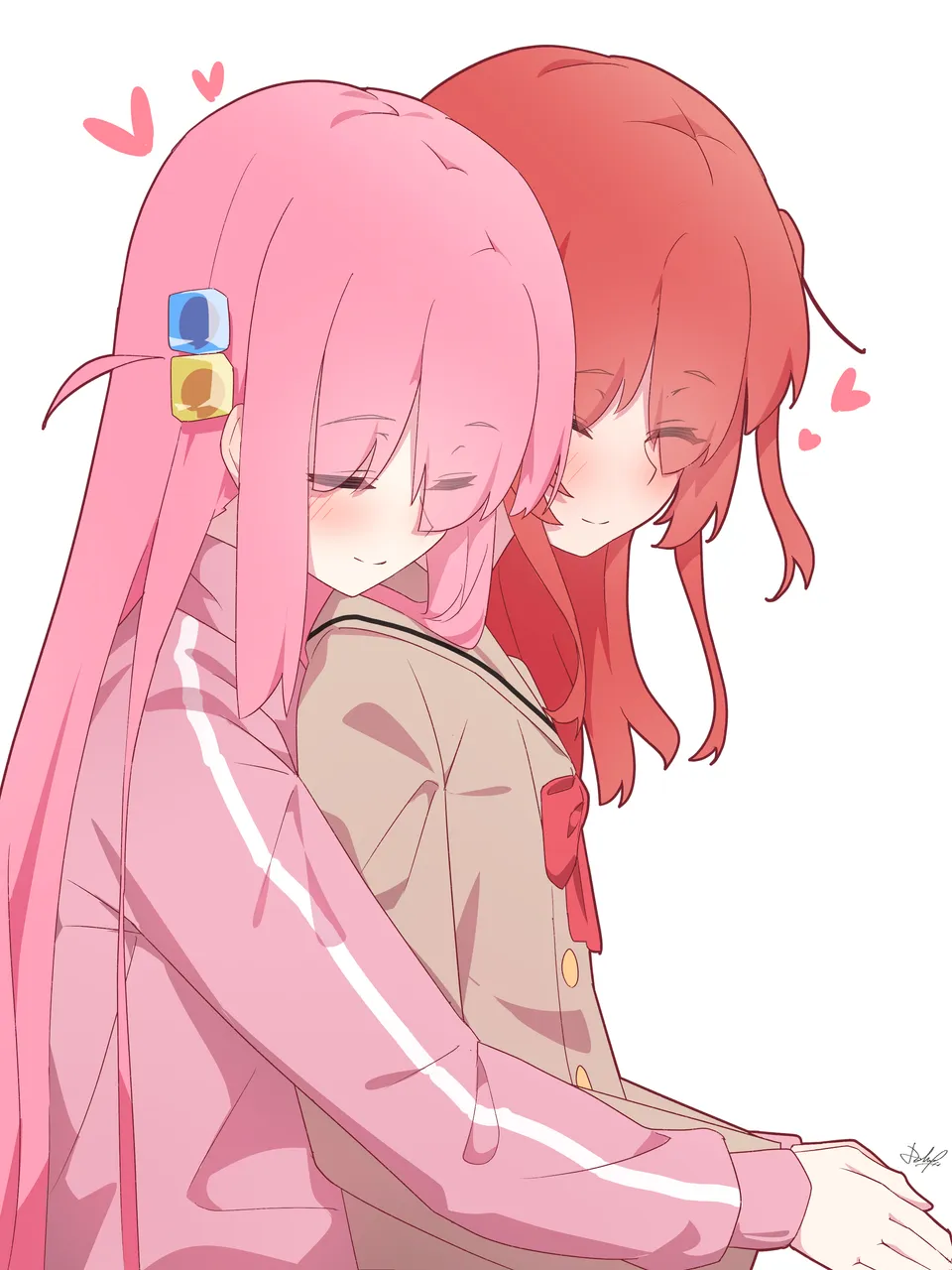 2girlsblushclosed_eyesclosed_mouthcube_hair_ornamenthair_ornamenthearthughug_from_behindjacketlight_smilemultiple_girlsone_side_uppink_hairpink_jacketred_hairschool_uniformshuka_high_school_uniformsimple_backgroundsplit_mouthwhite_backgroundyuri