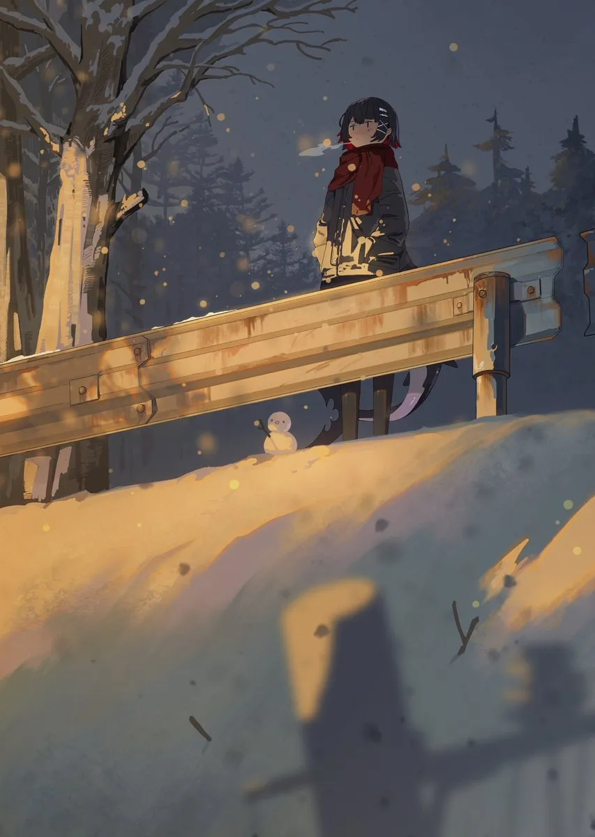 1girlblack_hairblack_pantyhosebreathcoatfinsfish_tailgrey_coatgrey_skyhands_in_pocketsoutdoorspantyhosered_scarfscarfshark_girlshark_tailskysnowingsnowmansolotailtreewinter_clotheswinter_coat