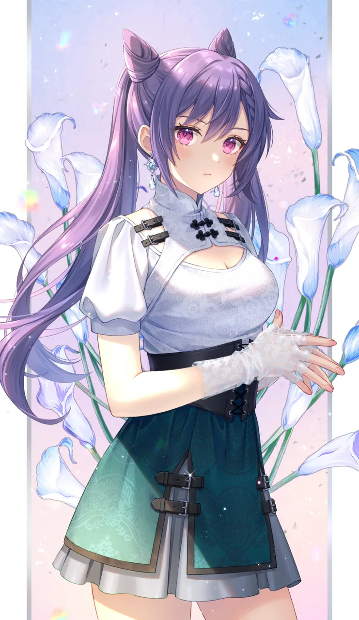 1girlalternate_costumebreastscleavage_cutoutclothing_cutoutcone_hair_bundouble_bunearringsfingerless_glovesfloral_printglovesgreen_skirthair_bunhair_ornamentjewelrylong_hairlooking_at_viewerown_hands_togetherpurple_eyespurple_hairshirtskirtsolotwintailswhite_shirt
