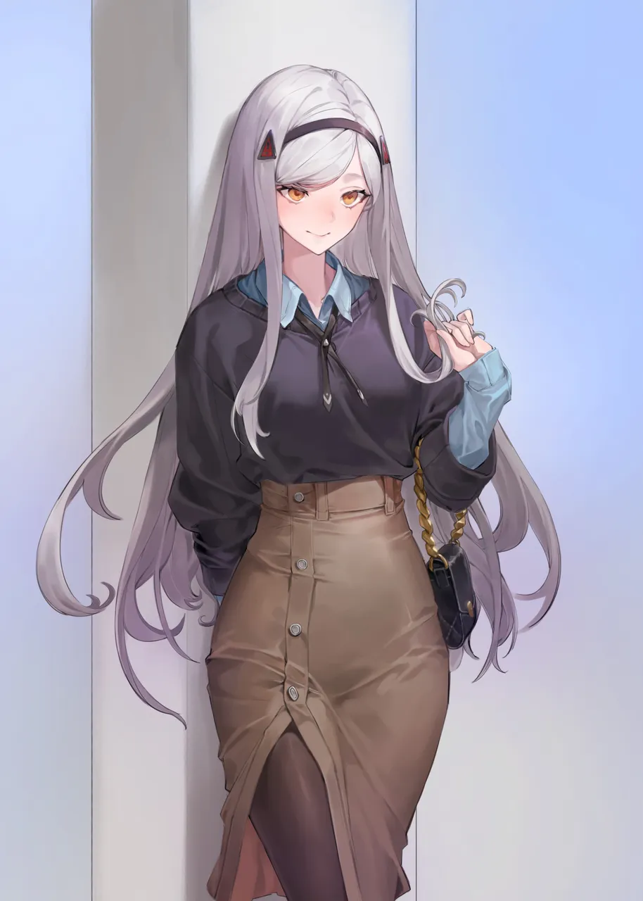 1girlagainst_wallarm_behind_backbagblue_shirtbrown_skirtbuttonscollared_shirtelbow_carryhair_ornamenthair_spread_outhairbandhand_in_own_hairhandbaghigh-waist_skirtholdingholding_bagholding_own_hairleaningleaning_on_objectlong_hairorange_eyespantyhosepencil_skirtshirtskirtsmilesolosweaterswept_bangstwirling_hairvery_long_hairwhite_hair