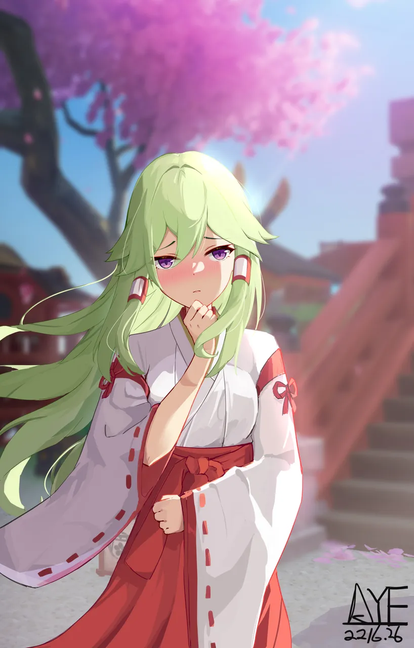 1girlalternate_costumealternate_hair_lengthalternate_hairstyleblushdateddaydetached_sleevesfloating_hairgreen_hairhair_between_eyeshair_intakeshair_tubeshakamahigh-waist_skirtjapanese_clotheskimonolong_hairlong_sleeveslooking_at_viewermikooutdoorspurple_eyesred_hakamaribbon-trimmed_sleevesribbon_trimskirtsolospring_(season)stairsstandingsunlightvery_long_hairwhite_kimono