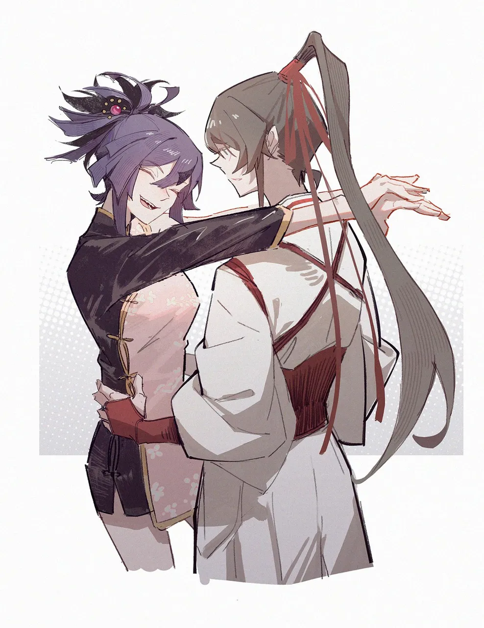 2girlsarms_around_neckbrown_hairclosed_eyeshair_between_eyeshair_bunhakamahakama_skirthand_on_another's_waisthigh_ponytailjapanese_clotheskimonolong_hairmotoyuimultiple_girlsninjaponytailpurple_hairred_ribbonribbonsamuraisidelockssimple_backgroundsingle_hair_bunskirtsmilestandingteethtraditional_clotheswhite_kimonoyuri