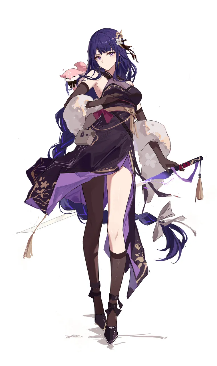 1girlalternate_costumebare_shouldersblack_thighhighsbraidbreastscleavagedressfull_bodyhair_ornamentholdingholding_weaponjapanese_clotheslong_hairlooking_at_viewerlow-braided_long_hairlow-tied_long_hairpurple_eyespurple_hairsolothighhighsvery_long_hairweaponwhite_background