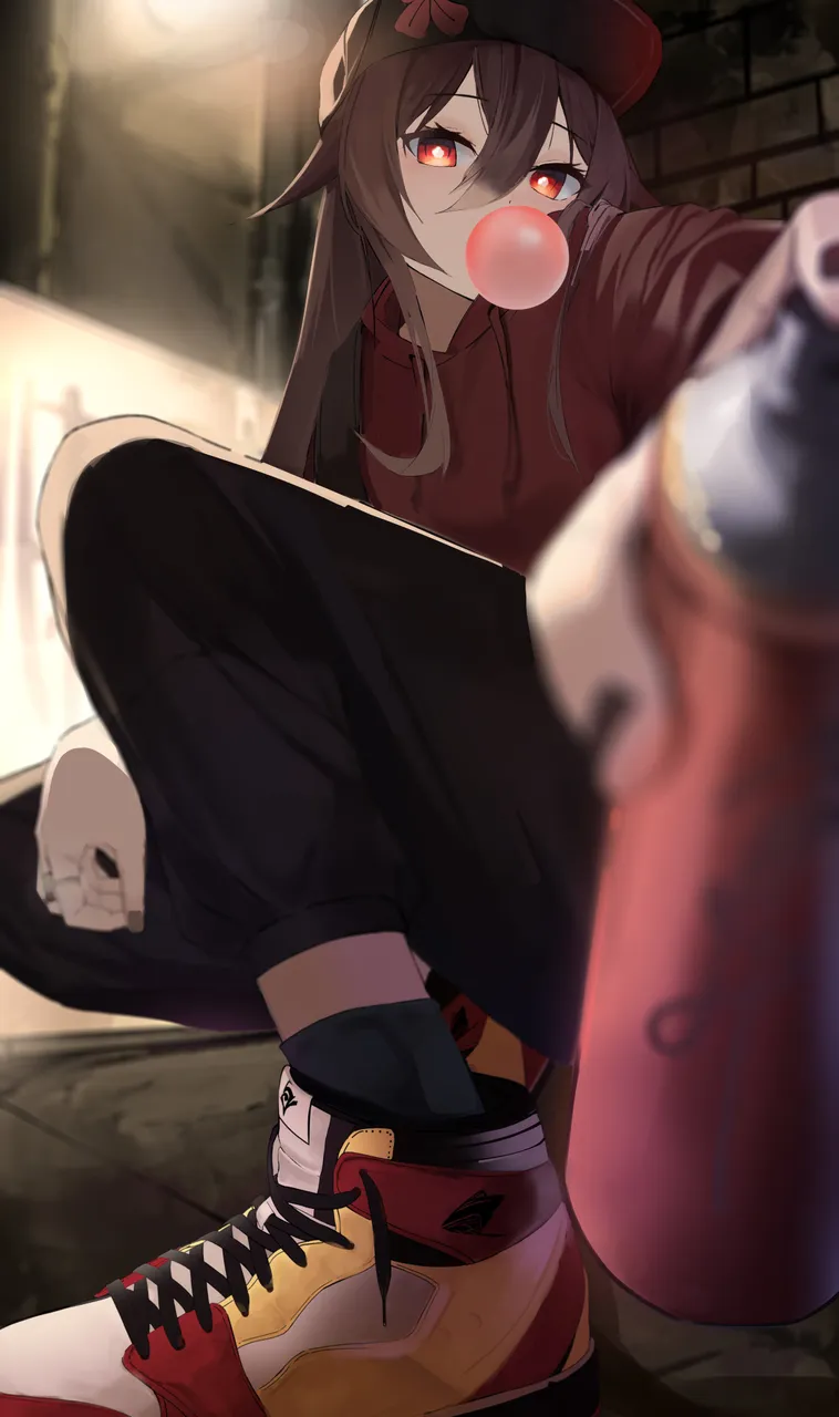 1girlalternate_costumeankle_socksbaseball_capblack_nailsblack_pantsblack_socksblowing_bubble_gumblurryblurry_foregroundbrown_hairchewing_gumcontemporaryflower-shaped_pupilsfootwear_focushair_between_eyeshatholdinghoodhood_downhoodielong_hairmulticolored_shoespantsred_eyesred_hoodiered_shirtshirtshoessidelockssneakerssockssolospray_canstreetwearsymbol-shaped_pupils