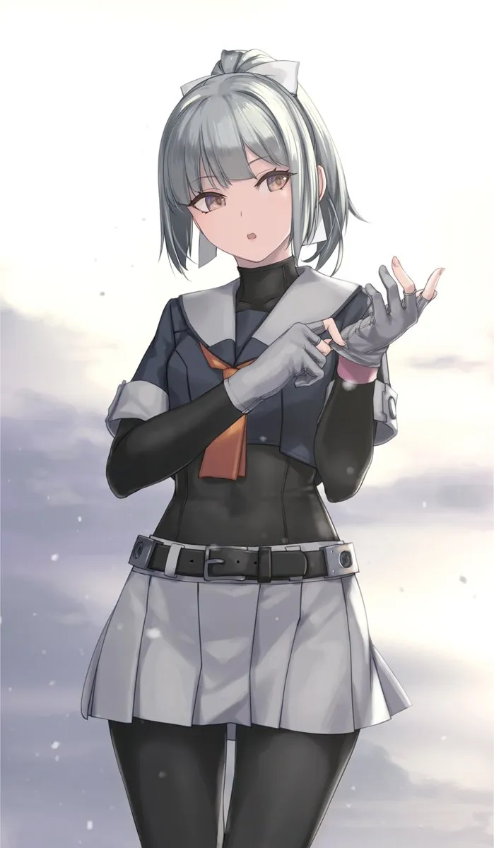1girladjusting_clothesadjusting_glovesbeltblack_pantyhosebodysuitbodysuit_under_clothesbreastscrop_topglovesgreen_hairgreen_skirtgrey_glovesgrey_hairgrey_sailor_collargrey_skirthair_between_eyeshair_flapshair_ribbonlooking_at_anotherneckerchiefnecktieopen_mouthorange_neckerchieforange_necktieoutdoorspantyhosepartially_fingerless_glovespleated_skirtponytailribbonsailor_collarschool_uniformserafukushort_sleevesskirtsmall_breastssnowsolowhite_ribbon
