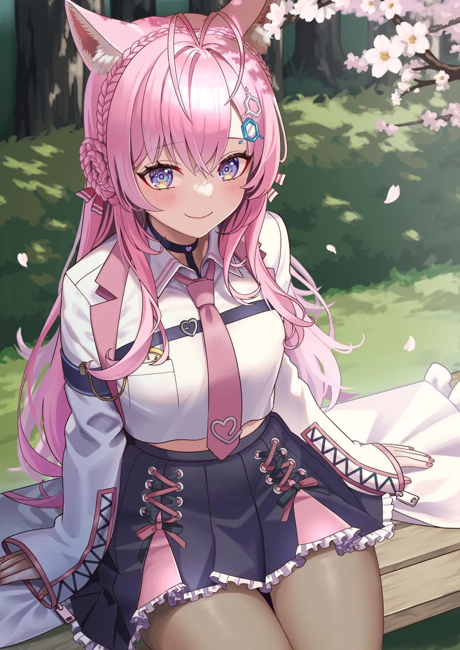 1girlanimal_ear_fluffanimal_earsantenna_hairbeltblack_beltblack_chokerblack_ribbonblack_skirtbraidbraided_bunbrown_pantyhosecherry_blossomschest_beltchokerclosed_mouthcoatcollared_shirtcrop_topcrown_braidfingernailsfrilled_skirtfrillshair_between_eyeshair_bunhair_ribbonhexagon_hair_ornamentlab_coatlong_hairlong_sleevesmidriff_peeknail_polishnecktieoutdoorspantyhosepink_hairpink_nailspink_necktiepink_ribbonpink_skirtpocket_watchpurple_eyesred_ribbonribbonshirtsittingskirtsleeves_past_wristssmilesolospring_(season)tie_cliptreetwo-tone_skirtvirtual_youtuberwatchwhite_coatwhite_shirtwolf_earswolf_girl