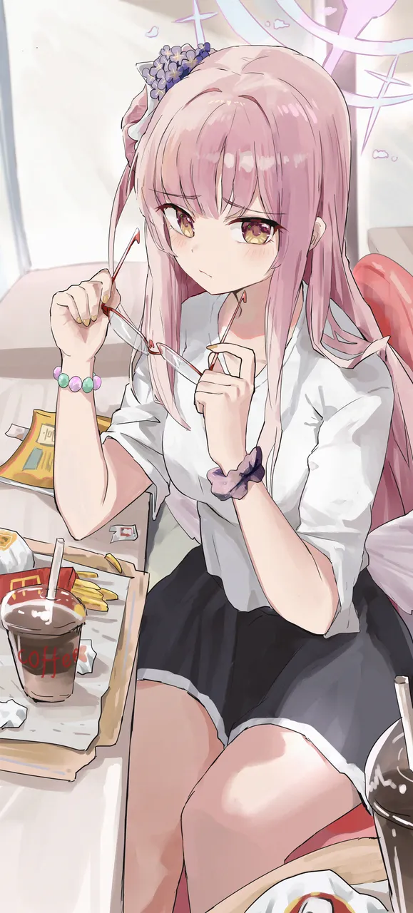1girlalternate_costumeblushbreastscupdisposable_cupfeet_out_of_framefoodfrench_frieshair_bunhaloholdingholding_removed_eyewearindoorslooking_at_viewermedium_breastspink_hairrestaurantscrunchieshirtsingle_side_bunsittingsolounworn_eyewearwhite_shirtwrist_scrunchie