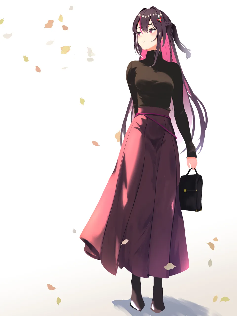 1girlalternate_costumearm_behind_backbagblack_hairblack_shirtblushbraidbreastsclosed_mouthcolored_inner_hairfalling_leavesflowerfull_bodyhair_flowerhair_intakeshair_ornamenthalf_up_half_down_braidhalf_updohandbagholdingholding_bagleaflong_hairlong_skirtlong_sleevesmedium_breastsmulticolored_hairpink_eyespink_hairpink_skirtponytailshirtshirt_tucked_insimple_backgroundskirtsmilesolostandingstraight_hairstreaked_hairtaut_clothestaut_shirtturtleneckvirtual_youtuberwhite_backgroundwhite_hairwind