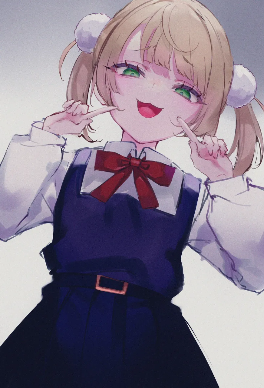 1girl:3aged_downbeltblack_beltblonde_hairblue_skirtblue_vestblunt_bangsbowbowtiecollared_shirtdressfinger_to_cheekfrom_belowgesugaogradient_backgroundgreen_eyeshair_ornamenthands_uplong_sleeveslooking_at_vieweropen_mouthpinafore_dresspleated_skirtpom_pom_(clothes)pom_pom_hair_ornamentpuffy_long_sleevespuffy_sleevesred_bowred_bowtieschool_uniformshirtshort_hairside_partsimple_backgroundskirtsleevelesssleeveless_dresssmilesmugsolotwintailstwitter_sukiupper_bodyvestvirtual_youtuberwhite_backgroundwhite_shirt