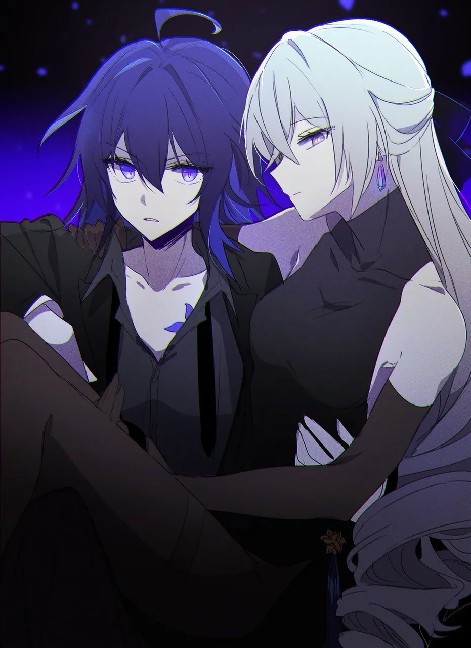 2girlsahogebare_shouldersblack_shirtblack_sleevesblue_eyesblue_hairbreastsclosed_mouthcollarbonecoupleearringselbow_glovesglovesgrey_hairhair_between_eyesjewelrylarge_breastslooking_at_viewermultiple_girlsnightparted_lipsshirtsmileyuri