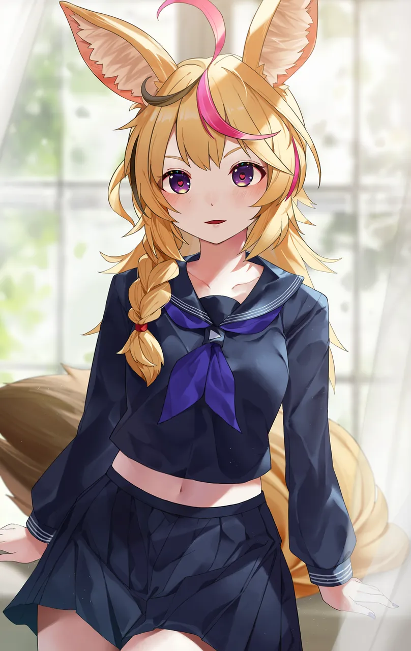 1girlahogeanimal_ear_fluffanimal_earsaogami_high_school_uniformblack_hairblack_sailor_collarblack_serafukublack_skirtblonde_hairblushbraidbreastscowboy_shotcropped_shirteyes_visible_through_hairfox_earsfox_girlfox_tailhair_ornamentheartheart-shaped_pupilslong_hairlong_sleeveslooking_at_viewermidriffmulticolored_hairnavelneckerchiefofficial_alternate_costumeparted_lipspink_hairpleated_skirtpurple_eyespurple_neckerchiefsailor_collarschool_uniformserafukuskirtsmall_breastssmilesolostreaked_hairsymbol-shaped_pupilstailtwo-tone_hairvirtual_youtuber