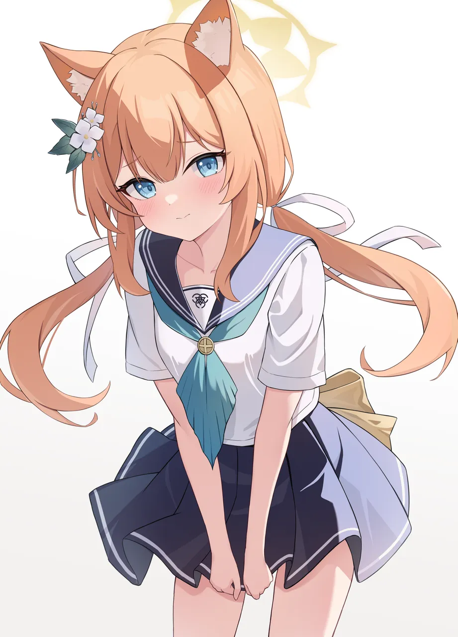 1girlalternate_costumeanimal_ear_fluffanimal_earsblue_eyesblue_neckerchiefblue_sailor_collarblue_skirtclosed_mouthcowboy_shotfloating_hairflowerhair_flowerhair_ornamenthair_ribbonhaloleaf_hair_ornamentleaning_forwardlong_hairlow_twintailsneckerchieforange_hairpleated_skirtraised_eyebrowsribbonsailor_collarschool_uniformserafukushort_sleevessidelockssimple_backgroundskirtsolothighstwintailswhite_backgroundwhite_flowerwhite_ribbonyellow_halo
