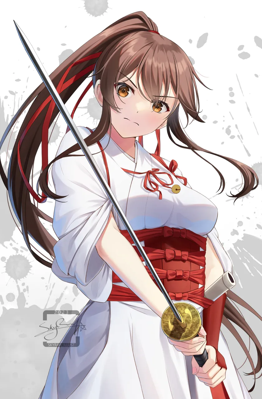 1girlbreastsbridal_gauntletsbrown_eyesbrown_hairclosed_mouthclothing_cutouthair_ribbonhip_ventholdingholding_swordholding_weaponjapanese_clotheskatanakimonolong_hairlooking_at_viewermedium_breastsobiponytailred_ribbonribbonsashserioussheathsignaturesimple_backgroundsingle_bridal_gauntletsoloswordweaponwide_sleeves
