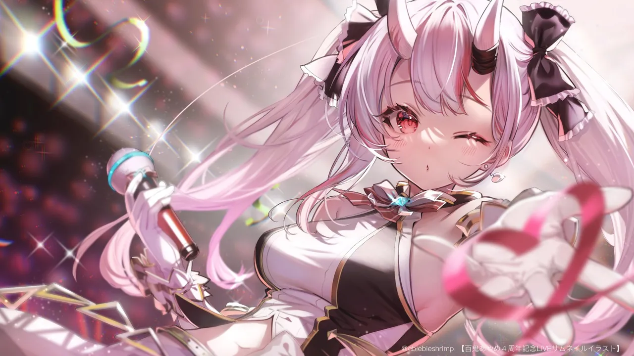 1girl;oalternate_breast_size_(larger)arm_garterblack_bowblurryblushbowbreastscropped_shirtdepth_of_fieldearringsforeshorteningfrilled_bowfrillsgloveshair_bowheartheart_earringsholdingholding_microphonehololive_idol_uniform_(origin)hornsidoljewelrylong_hairlooking_at_viewermedium_breastsmicrophonemidriffmulticolored_hairnavelofficial_alternate_costumeone_eye_closedonioutstretched_armoutstretched_handparted_lipspuckered_lipsred_eyesred_hairred_ribbonred_streaksribbonshirtskin-covered_hornsskirtsleevelesssleeveless_shirtsolosparklestage_lightsstandingstreaked_hairtwintailstwitter_usernametwo-tone_hairupper_bodyvirtual_youtuberwhite_gloveswhite_hairwhite_shirtwhite_skirt