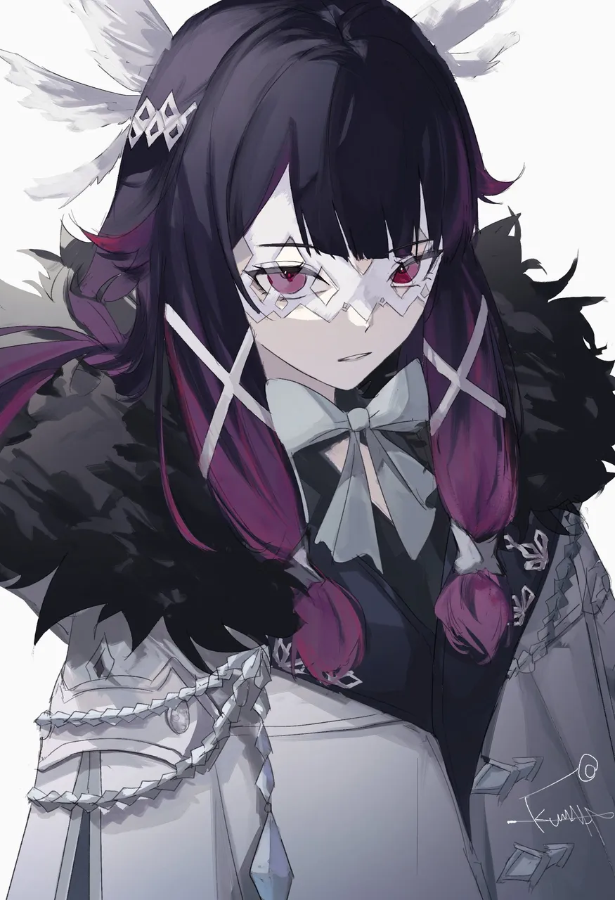 1girlblunt_bangsboweye_maskfatui_coatfur_trimhalf-closed_eyeshime_cutjacketlong_hairlooking_at_viewermaskmulticolored_hairpurple_eyespurple_hairsimple_backgroundsolotwo-tone_hairunusually_open_eyeswhite_backgroundwhite_bowwhite_jacket