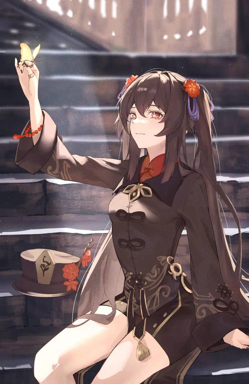 1girlarm_upbead_braceletbeadsblack_coatblack_hatblack_nailsblack_shortsbraceletbrown_hairclosed_mouthcoatcollared_coatcollared_shirtflowerflower-shaped_pupilshair_ornamenthathat_flowerhat_ornamentjewelrylong_hairmandarin_collarmultiple_ringsnail_polishplum_blossomsporkpie_hatred_eyesred_shirtringshirtshortssittingsitting_on_stairssolostairssymbol-shaped_pupilstailcoattalismantasselthumb_ringtwintailsunworn_hatunworn_headwear