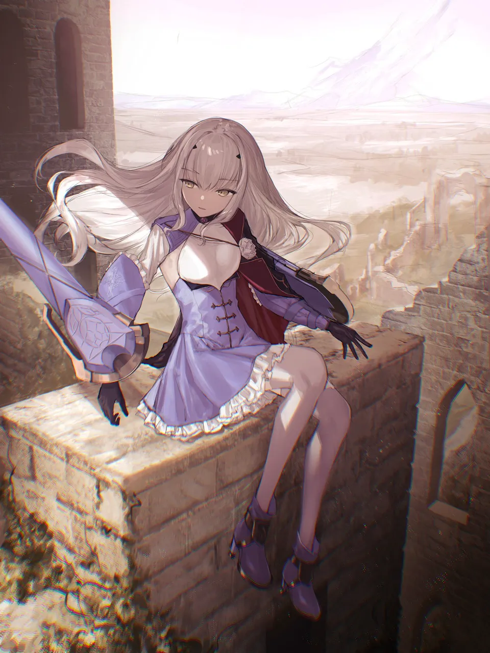 1girlblack_glovesblonde_hairblue_dressbootsbreastsbrown_eyescapecastlechromatic_aberrationcitycloakcrackdressfairy_sword_arondightflowerfull_bodygloveshigh_heelslong_hairlong_sleevesmossmountainmountainous_horizonnatureon_wallopen_mouthornamentroseruinsshadowsittingskysmall_breastssolostone_wallsunthighhighsthighhighs_under_bootswallweaponwhite_hairwhite_thighhighswindow
