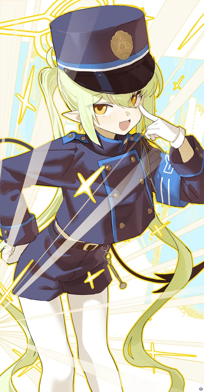 1girlarmbandblack_hatblack_shirtblack_shortsblack_tailblue_armbanddemon_girldemon_taileyelid_pullfeet_out_of_frameglovesgreen_hairhalohand_on_own_hiphatleaning_forwardlong_hairlong_sleeveslooking_at_viewermesugakimidriff_peekopen_mouthpantyhosepeaked_cappointy_earsshirtshort_shortsshortssmilesolosparklesparkling_aurastandingtailtwintailswhite_gloveswhite_pantyhoseyellow_eyesyellow_halo