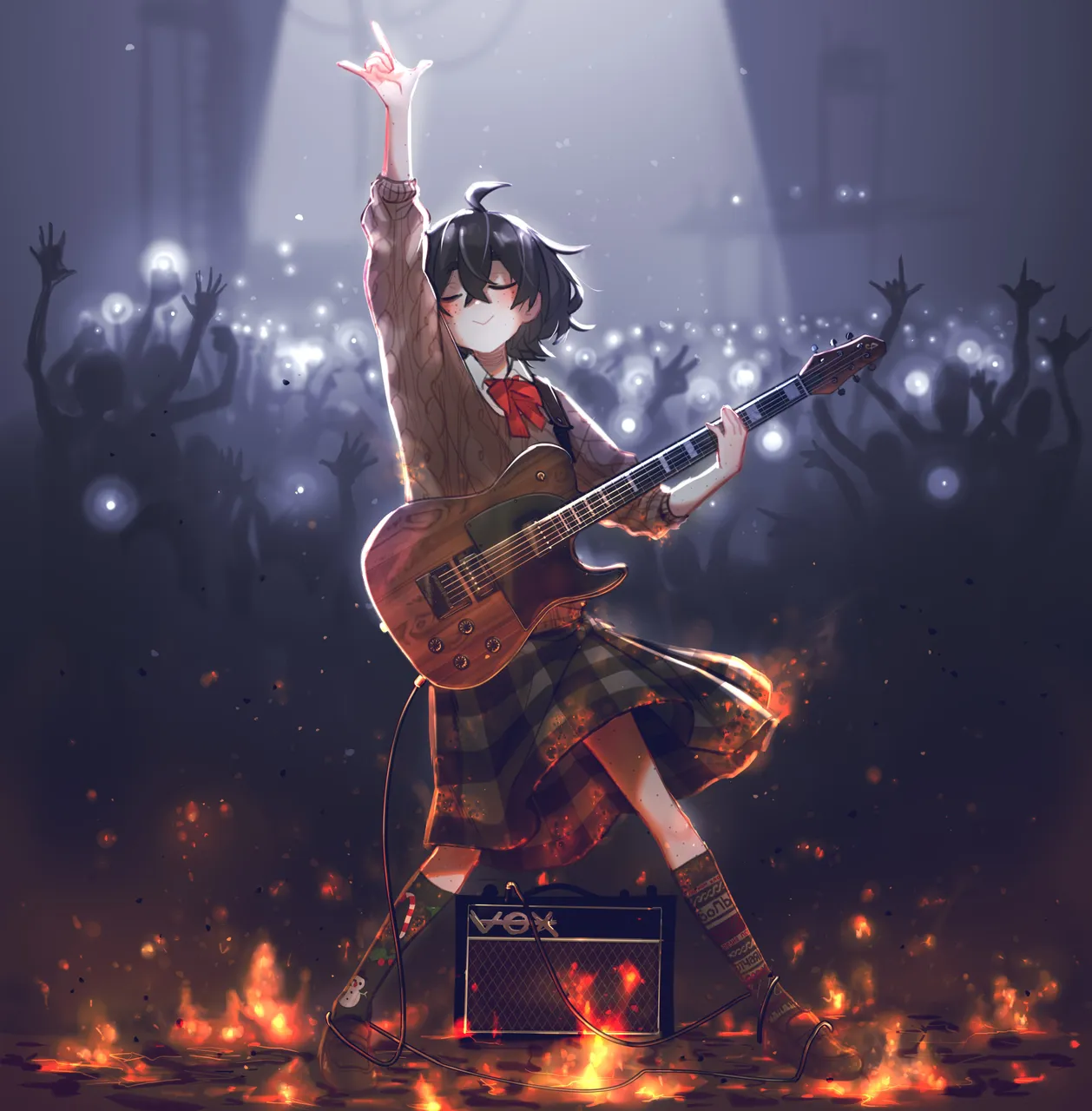 1girl\m/arm_upblack_hairbowbowtieboxbrown_sweatercablecrowdfirefrecklesfull_bodygrey_skirtguitarholdinginstrumentkneehighsplaid_clothesplaid_skirtred_bowred_bowtierussian_textschool_uniformshirtskirtsmilesockssolo_focussweater