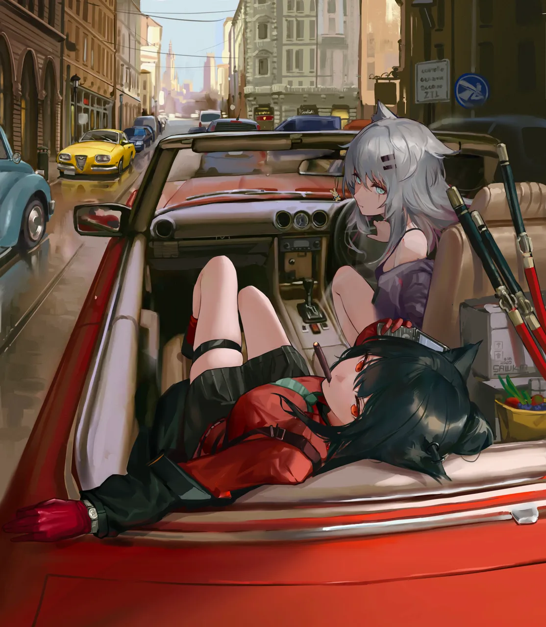 2girlsanimal_earsblack_hairblack_skirtboxbreastsbuildingcarcar_seatcellphonecigarcityconvertibledayflip_phoneglovesgrey_hairhair_ornamenthairclipholdingholding_phonelarge_breastslong_hairmotor_vehiclemouth_holdmultiple_girlsoutdoorsphonered_carred_glovesred_shirtroadscarscar_across_eyescar_on_faceshirtsignskirtsmokesteering_wheelthigh_strapweaponwolf_earswolf_girl