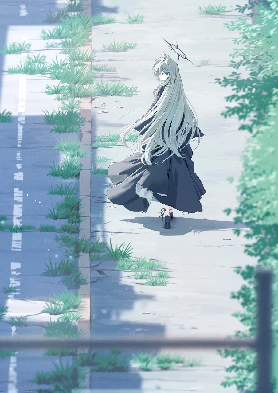 1girlahogeanimal_earsblack_dressblack_haloblack_shoesblue_eyesbroken_halocrackcross_hair_ornamentdark_halodaydressextra_earsfrilled_dressfrillsgrey_hairhair_ornamenthalolong_dresslong_hairlong_sleeveslooking_to_the_sideovergrownshadowshoessolowalkingwolf_ears
