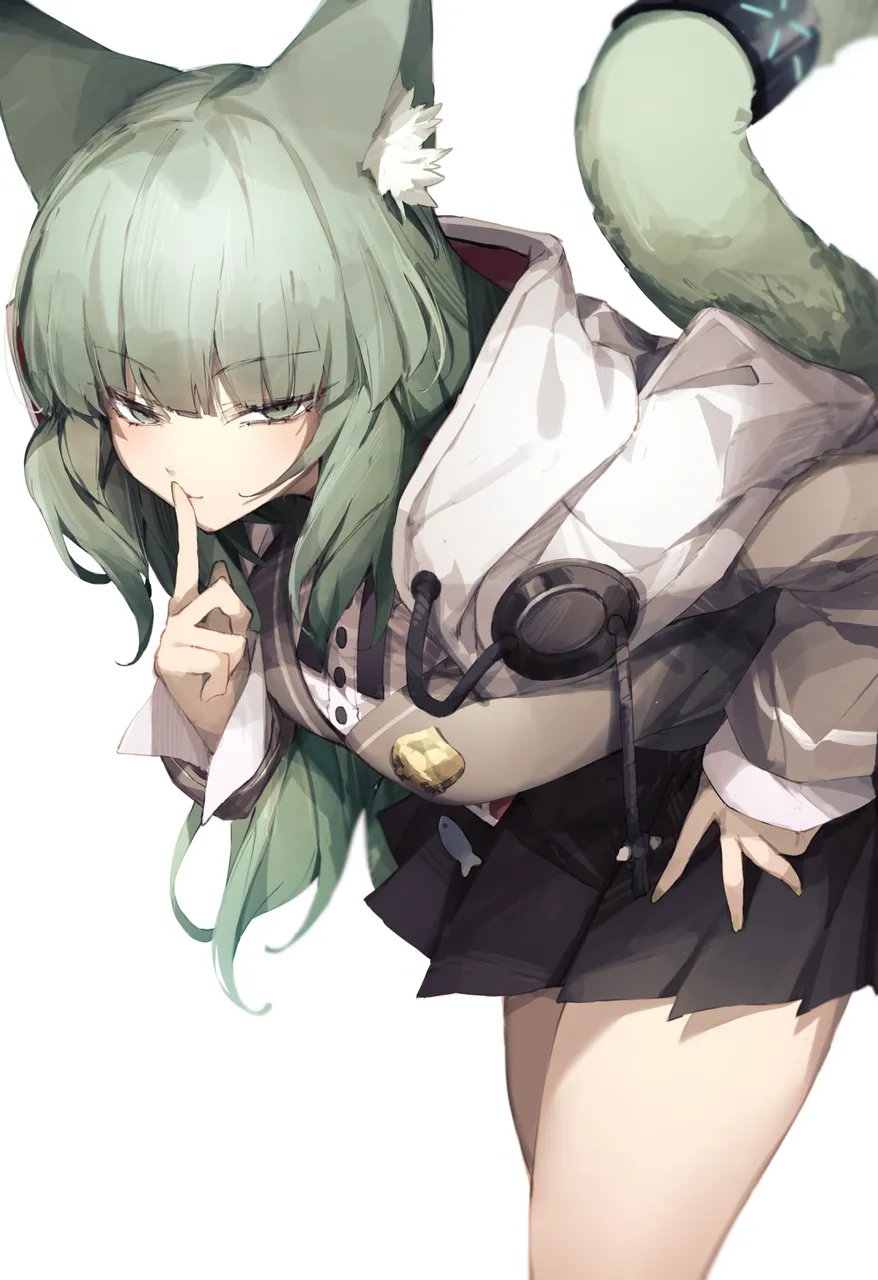 1girlanimal_ear_fluffanimal_earsblack_ribbonblack_skirtblunt_bangscat_earscat_girlcat_tailcowboy_shotfinger_to_mouthgreen_eyesgreen_hairgrey_sweater_vesthalf-closed_eyesindex_finger_raisedinfection_monitor_(arknights)jacketleaning_forwardlong_hairlooking_at_viewerneck_ribbonpleated_skirtribbonshirtshushingsimple_backgroundskirtsolosweater_vesttailtail_ornamenttail_ringthighswhite_backgroundwhite_jacketwhite_shirt