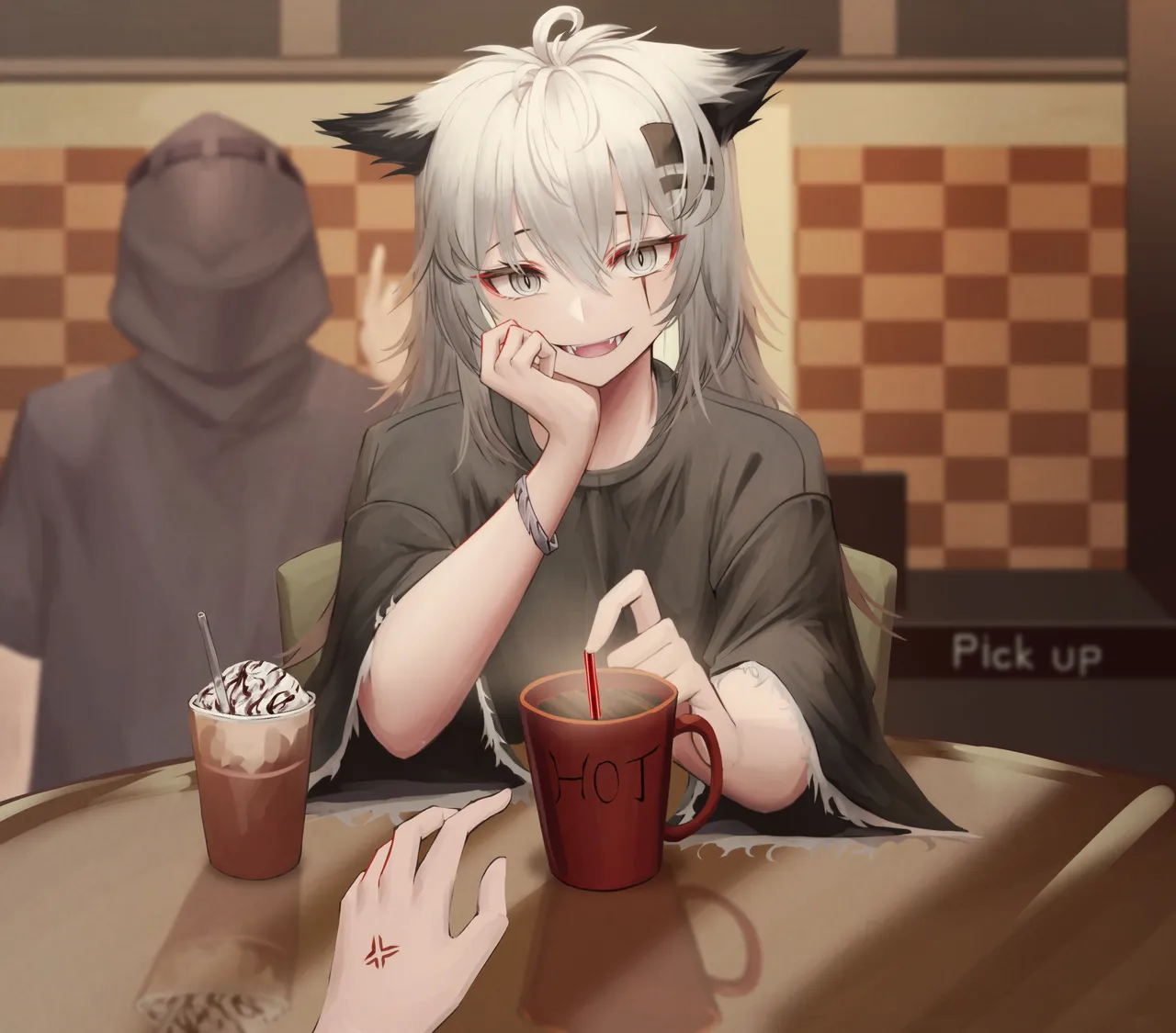 1girl2others:dalternate_costumeanger_veinanimal_earsblack_hairblack_hoodieblack_shirtbraceletcupdrinking_straweyebrows_hidden_by_haireyeshadowfangsfoodgrey_eyesgrey_hairhair_between_eyeshand_on_own_headhoodhood_uphoodiehot_chocolateice_creamindex_finger_raisedindoorsjewelrylong_hairlooking_at_viewermakeupmulticolored_hairmultiple_othersopen_mouthpovred_eyeshadowreflectionscarscar_across_eyescar_on_faceshirtshort_sleevessittingsmilesteamupper_bodywide_sleeveswolf_ears