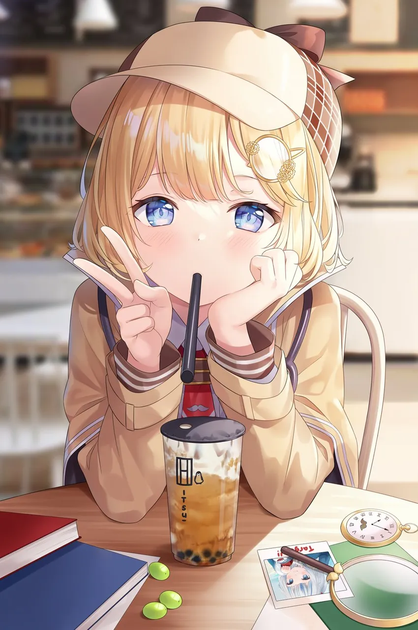 1girlblonde_hairblue_eyesblurryblurry_backgroundblushbob_cutbookbreastsbrown_capeletbrown_hatbrown_jacketbubble_teacapeletchaircollared_shirtcupdepth_of_fielddetectivedisposable_cupdrinking_strawfoodfruitgrapeshair_ornamenthands_uphatindoorsjacketlarge_breastslong_sleeveslooking_at_viewermagnifying_glassmilestone_celebrationmouth_holdmustache_printnecktieon_chairphoto_(object)plaid_clothesplaid_hatpocket_watchpov_across_tablered_necktieroman_numeralshirtshort_hairshort_necktiesittingsolotablevvirtual_youtuberwatchwhite_shirt