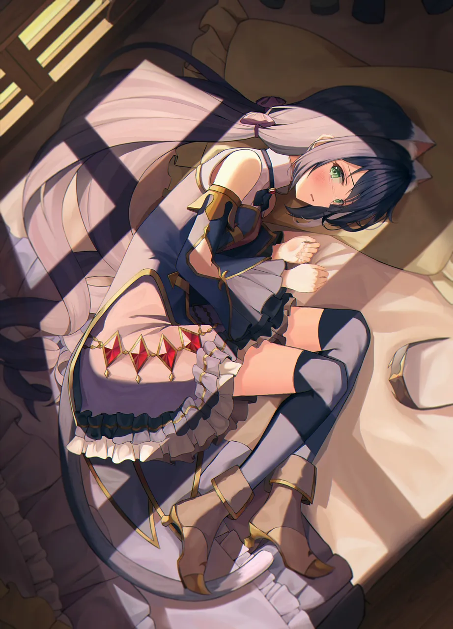 1girlanimal_ear_fluffanimal_earsankle_bootsbare_shouldersbedblack_hairblack_thighhighsblushbootsbrown_bootscat_earscat_girlcat_tailcryingcrying_with_eyes_opendetached_sleevesdressfold-over_bootsfrom_abovegreen_eyeshigh_heel_bootshigh_heelslong_hairlooking_at_viewerlow_twintailslyingon_bedon_sideopen_mouthparted_lipspillowprofileshirtshort_dresssleevelesssleeveless_dresssolotailtearsthighhighstwintailsvery_long_hairwhite_shirtwindow_shadow